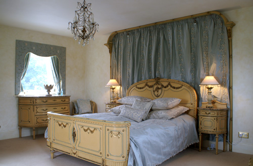‘Venetian’ finish walls and stencilled scrolling motifs with an antique French bedroom suite.