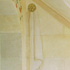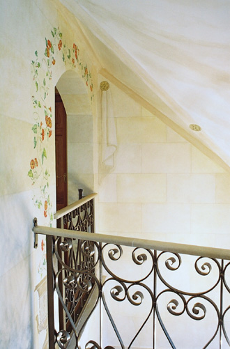 A romantic scheme exploiting the odd shapes and angles of this hall, stairs and landing, using stoneblocking, stencilled flowers and foliage, and
