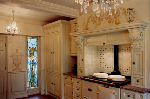 The walls of this linked kitchen and conservatory were colourwashed in a stony glaze and stencilled with