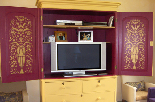 This Victorian pine linen-press, adapted for a TV, has been painted and stencilled to tone with the window shutter treatment.