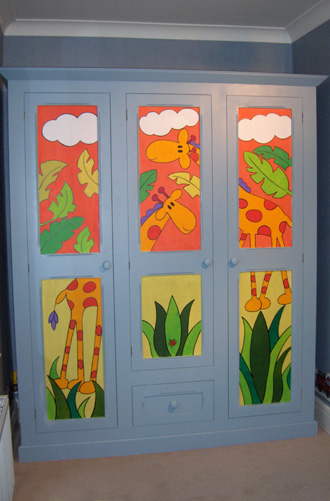 The brief here was to paint a newly built wardrobe for a young boys room. The colours were to be bright with a jungle theme. You can also see Angela's original design