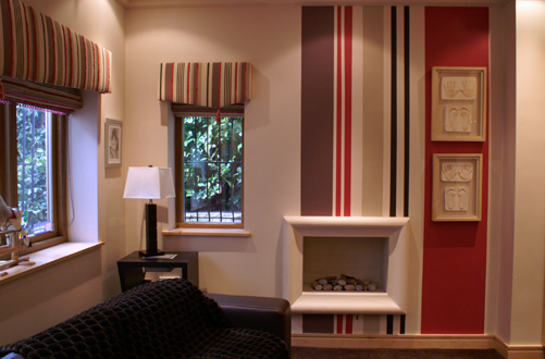 A dramatic striped scheme for a sophisticated children’s den. The inspiration comes from the fabric used for the blinds and pelmets.