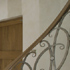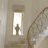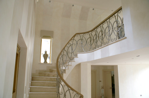 Hall, stairs and landing in a newly-built house. The walls were treated with a soft ‘Venetian’ finish and striped in a soft metallic silver. The ironwork up the stairs was stippled in a mixture of metallic shades.